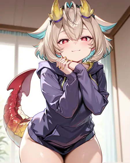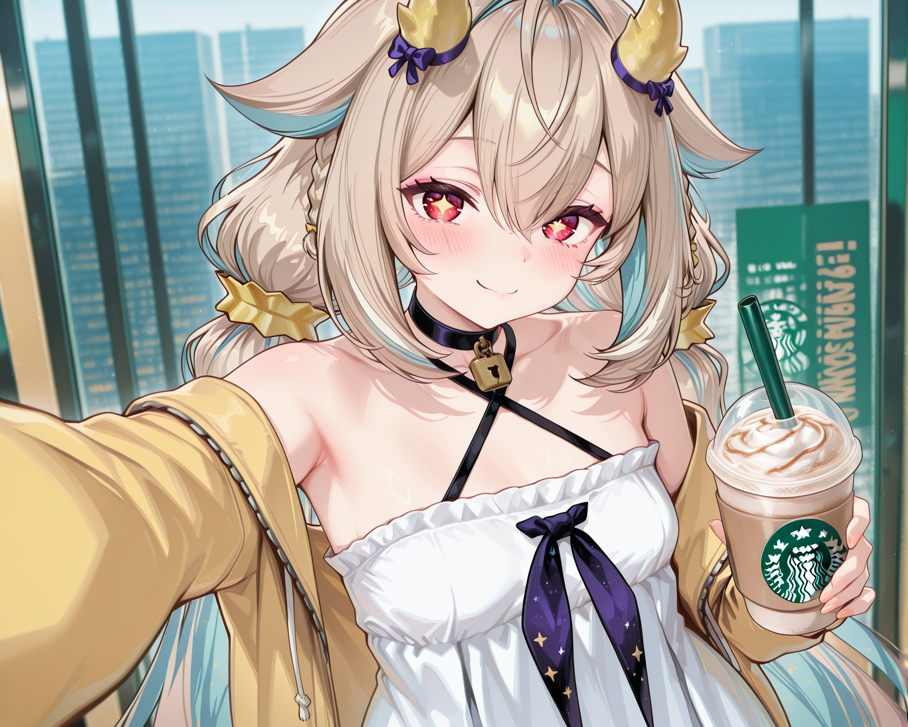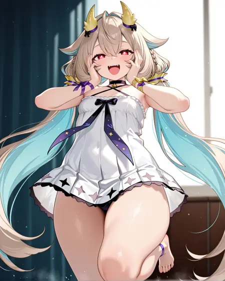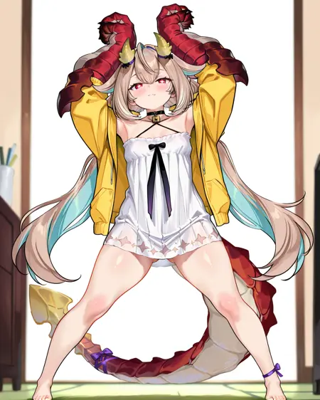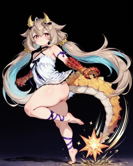 | 학습된 단어 | UtaSa, hazel hair, multicolored hair, blue colored inner hair, hair between eyes, sidelocks, red eyes, very long low twintails, short dragon yellow horns, small breasts,복사됨! lock choker, halterneck, galaxy straps, white dress, clothing cutout trim, purple arm ribbons, purple anklet ribbons, leg ribbons, barefoot,복사됨! off shoulder, yellow jacket,복사됨! dragon arms, dragon claws, dragon tail,복사됨! |