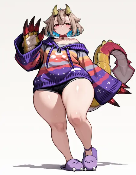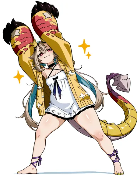 | 训练词汇 | UtaSa, hazel hair, multicolored hair, blue colored inner hair, hair between eyes, sidelocks, red eyes, very long low twintails, short dragon yellow horns, small breasts, lock choker, halterneck, galaxy straps, white dress, star-shaped cutouts on hem, purple arm ribbons, purple anklet ribbons, leg ribbons, barefoot, yellow nail polish, 已复制! off shoulder, yellow sweater jacket 已复制! dragon arms, dragon claws, dragon tail 已复制! NasClass, hazel hair, multicolored hair, blue colored inner hair, hair between eyes, sidelocks, red eyes, short hair, short dragon yellow horns, red lock choker, collarbone, off shoulder, grey undershirt, multicolor hoodie, galaxy striped hoodie, drawstring, sleeves past wrists, black short shorts, ankle strap, purple slippers, dragon claws, dragon tail, 已复制! |