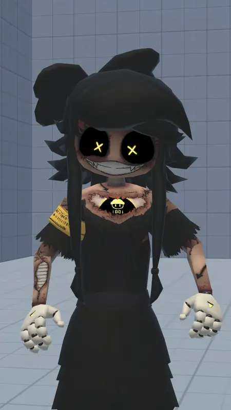 メインプロンプト:Cynessa、黒いドレス、黒いスカート、黒い髪、黄色い目、Xの瞳、Xの目、黒いハイヒール、黄色い腕輪、ローポリ、ひとり、1girl