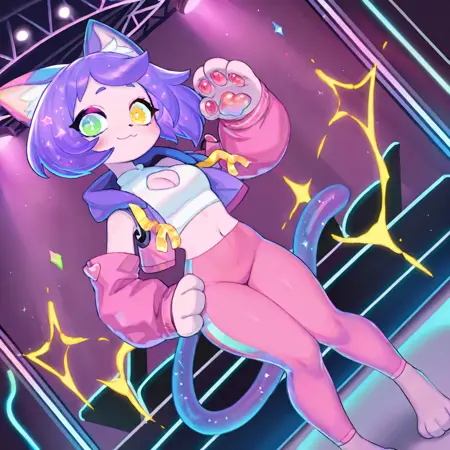 anthro, female, refantasia skin, light pink fur, 4 fingers, paws, colorful hair, short hair, heterochromia, star eyes, colorful tail, cropped hoodie, tanktop, pink short shorts, detached sleeves,