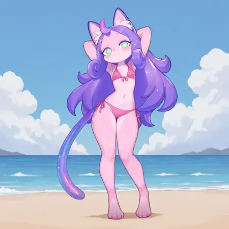 anthro, female, feline, pink fur, paws, purple hair, long hair, hair tuft, inner ear fluff, green eyes, star eyes, long tail, dress, translucent dress,