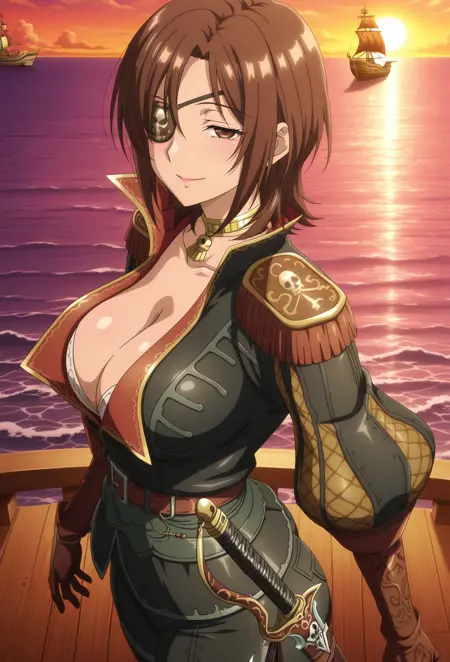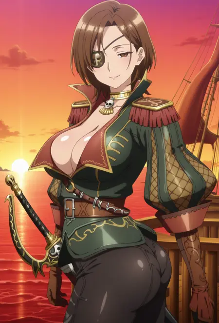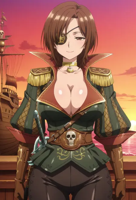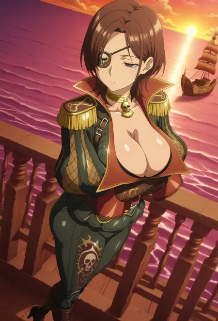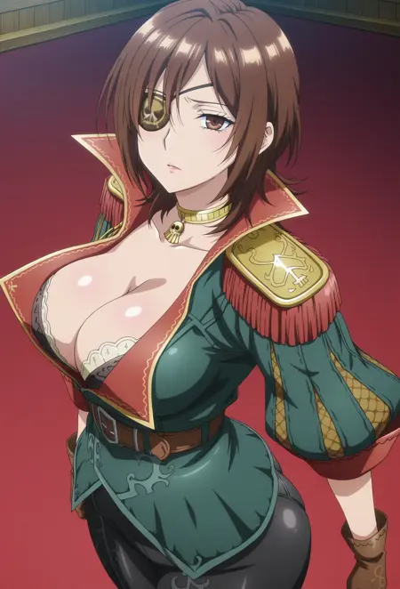 adl_(ge), 1girl, solo, mature woman, milf, large breasts, large ass, brown hair, short hair, medium hair, hair on own eyes, split bangs, brown eyes, epaulettes, cleavage, gold choker, pirate, popped collar, puffy sleeves, gloves, high heels,