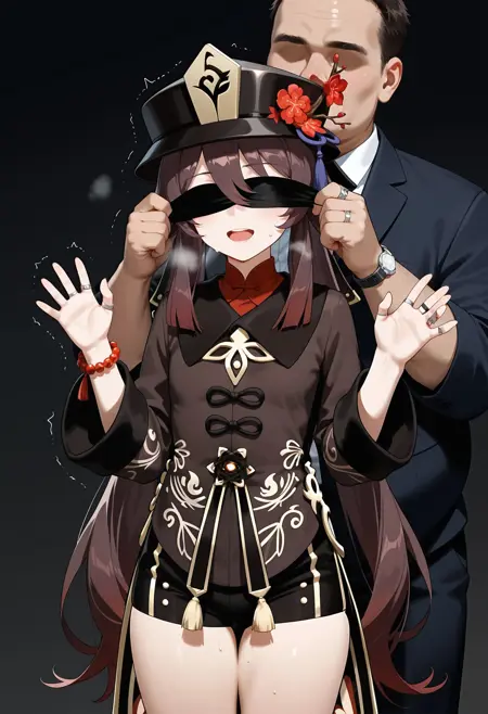blindfold, blndfld, bdsm, covered eyes, restrained, 1girl, 1boy, fat man, fat male, couple, faceless male, sweat, trembling, open mouth, heavy breathing, dark-skinned male, faceless male, holding blindfold, black background, <lora:blindfold_illustrious:0.7>