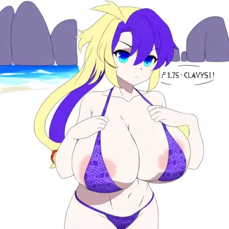 キーワード:傑作、最上質、素晴らしい品質、非常に美的、高解像度、極めて詳細、absurdres、編み込み髪、紫色の髪、大きな胸、金色の髪、多色の髪、頬紅、ジェンダースワップ(MTF)、金色の髪、青い目、1人の少女、シングル、長いまつげ、