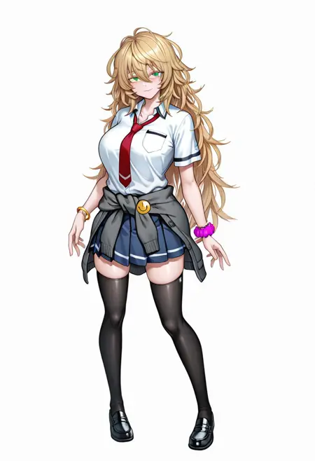 | 학습된 단어 | <lora:n4t4l13_fl3tch3r:1>복사됨! n4t4l13_fl3tch3r, green eyes, blonde hair, hair between eyes, messy hair, very long hair, large breasts,복사됨! school uniform, red necktie, short sleeves, wrist scrunchie, dark grey sweater around waist, smiley face button, blue pleated skirt, black thighhighs,복사됨! bra visible through clothes,복사됨! purple cheetah print bra,복사됨! taimanin suit, two-tone leotard, green leotard, black leotard, cleavage, bare shoulders, elbow gloves, side cutout, showgirl skirt, green thighhigh boots,복사됨! covered nipples, covered navel, cameltoe,복사됨! |