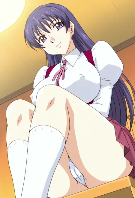 紫色眼睛,紫色头发,蓝色头发,长发,乳房,大乳房,裙子,校服,发带,袜子,巨乳,长袖