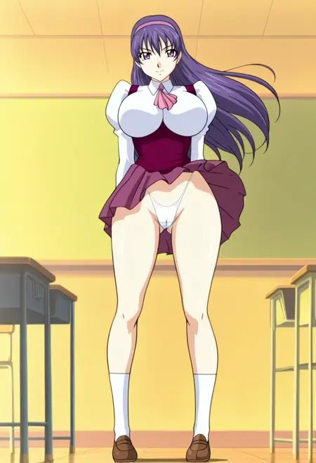 purple eyes, purple hair, blue hair, long hair, breasts, large breasts, skirt, school uniform, hairband, socks, huge breasts, long sleeves