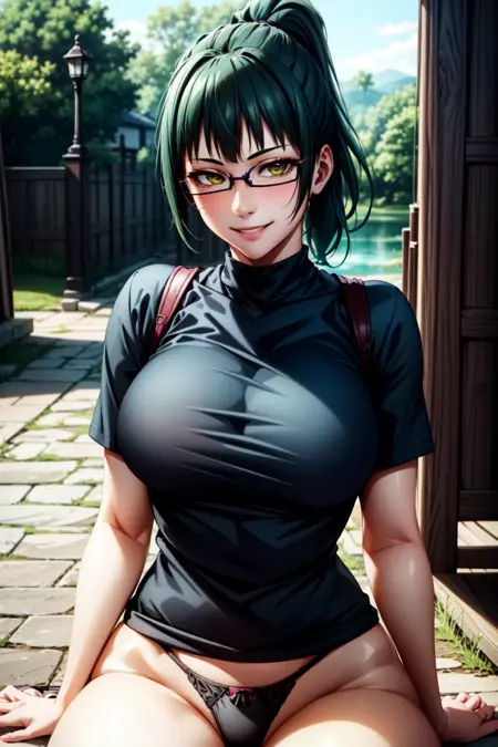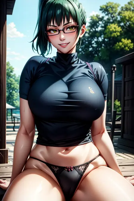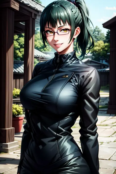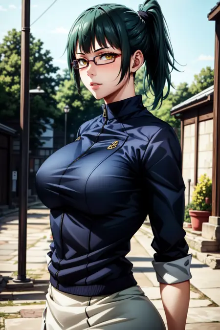 ZeninMakiNDV, 1girl, green hair, yellow eyes, large breasts, ponytail, glasses, jujutsu uniform, jacket, black skirt