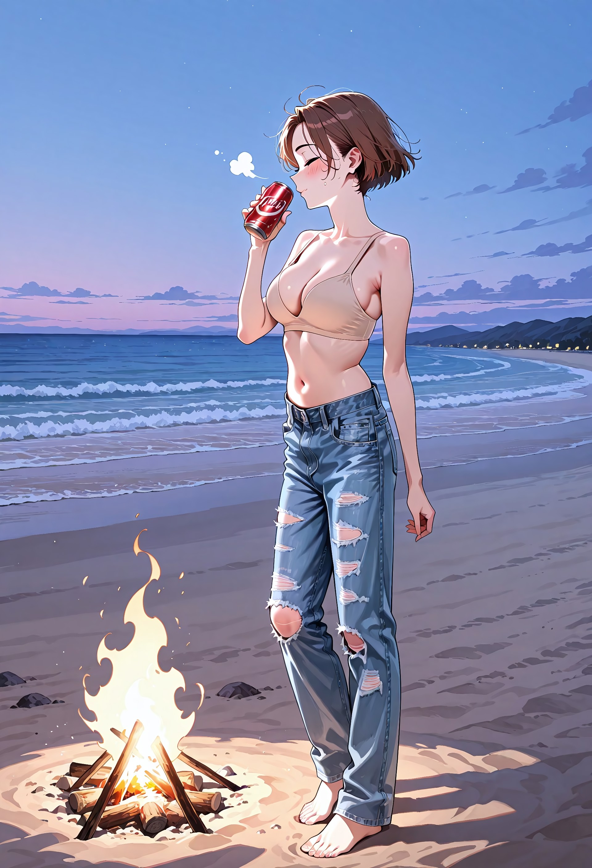 1girl, solo, brown hair, short hair, closed eyes, lips, collarbone, cleavage, medium breasts, navel, midriff