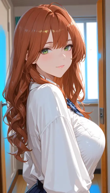 핵심 외모 — long_hair(붉은 금발/주황색 계열), green_eyes, 앞머리/나뉘어진 앞머리, 미세한 홍조, 부드러운 입술 강조.