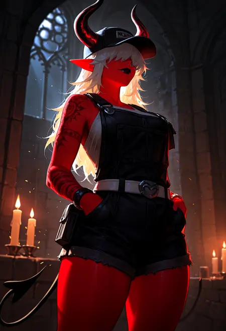 baseball cap, horns through headwear, overalls, shorts, white belt, belt pouch, bracelet,