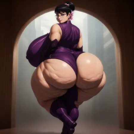 Cattleya, mature woman, tight purple apron-like dress, purple long boots, glasses, black hair, enormous boobs