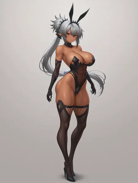 hair ribbon,black ribbon,fake animal ears,animal ears,rabbit ears,highleg,cleavage,highleg leotard,thighhighs,black gloves,elbow gloves,playboy bunny,black thighhighs,bare shoulders,black leotard,detached collar,strapless leotard,covered navel,see-through,strapless,ass visible through thick thighs,rabbit tail,black hairband,spiked hairband,spikes,spiked hair ornament,jewelry,fake tail,black high heels,groin,tight clothes,see-through leotard,covered abs,chest jewel,red gemstone,fishnets,fishnet thighhighs,crotch plate