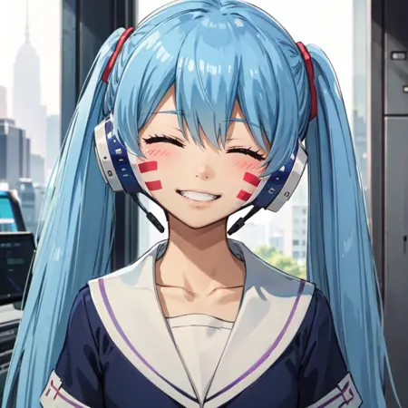 示例基础提示词: lora:HermitMio:1, harmit1, 1girl, solo, blue eyes, blue hair, long hair, twintails, facial mark, headphones, bodysuit