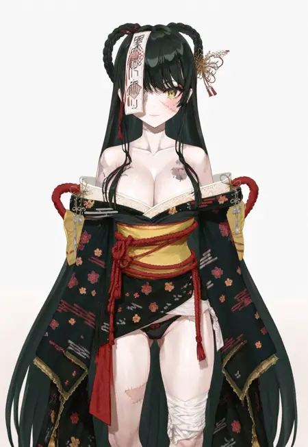 Inori1, 1girl, 单人, 长发, 乳房, 看向观众, 刘海, 大乳房, 黑发, 发饰, 裸露肩膀, 锁骨, 黄色眼睛, 辫子, 日式服装, 和服, 露肩, 腰带, 纹身, 疤痕, 腰带, 发环, 朱符, 缝合线, 符咒, 长袖, 极长发, 宽袖, 发髻, 绷带, 超长发, 黑色和服, 绷带腿