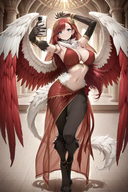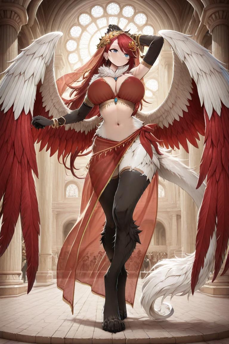 1girl, Maara Valtros, monster girl, griffon traits, animal hands, animal legs, feathered wings, multicolored wings, red wings, white wings, large wings, white tail, black claws, black arm fur, black leg fur, red hair, wild hairstyle, blue eyes, Huge breasts, hair ornament