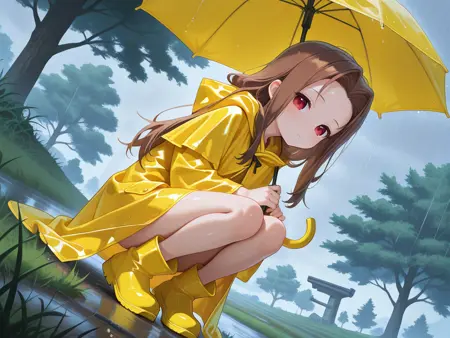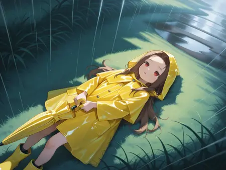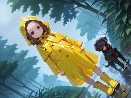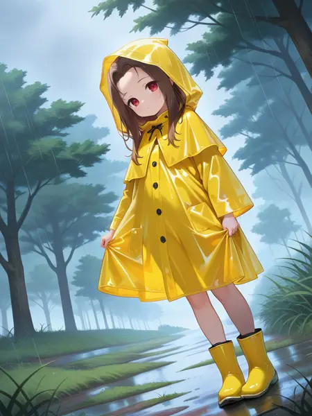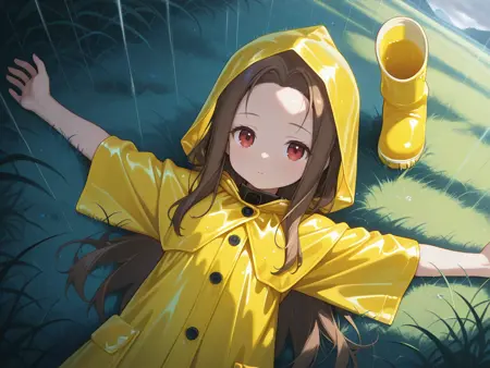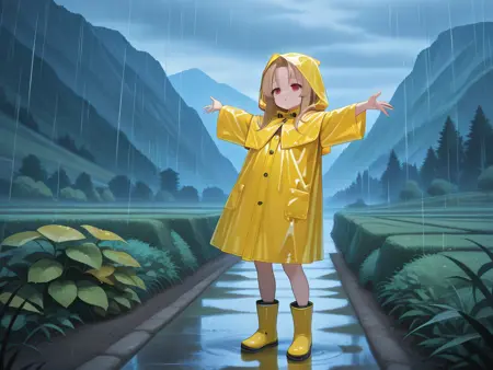 yellow raincoat,hood,rubber boots
