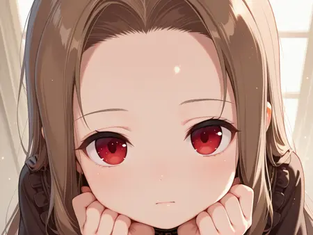 long hair,red eyes,brown hair,forehead