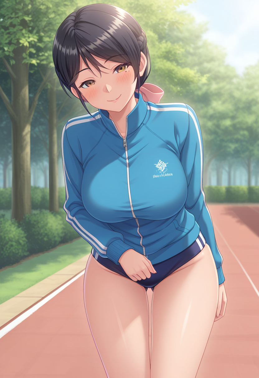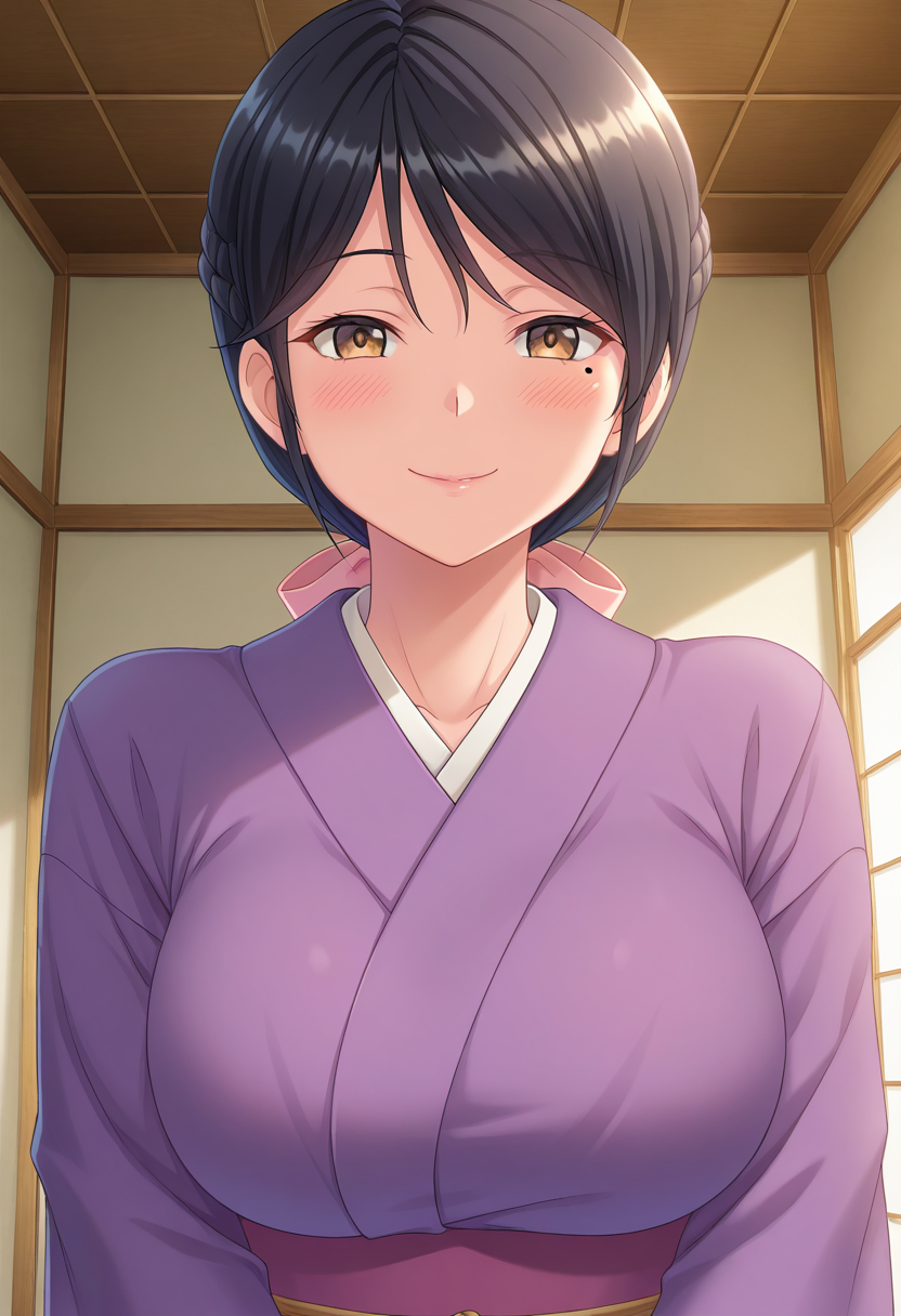 • mizuhoww, 성인 여성, 갈색 눈, 눈 밑 주근깨, 검은 머리, 긴 머리, 왕관 땋기, 낮은 꼬리, 분홍색 머리 리본, 큰 가슴,