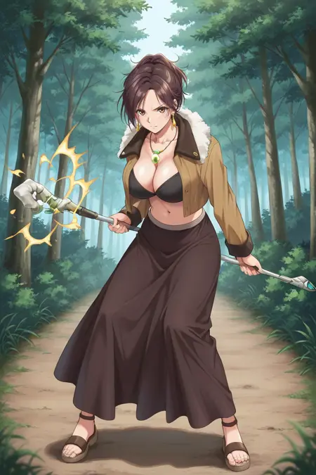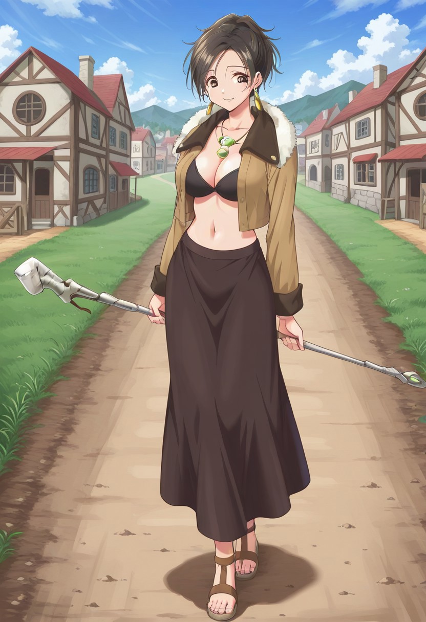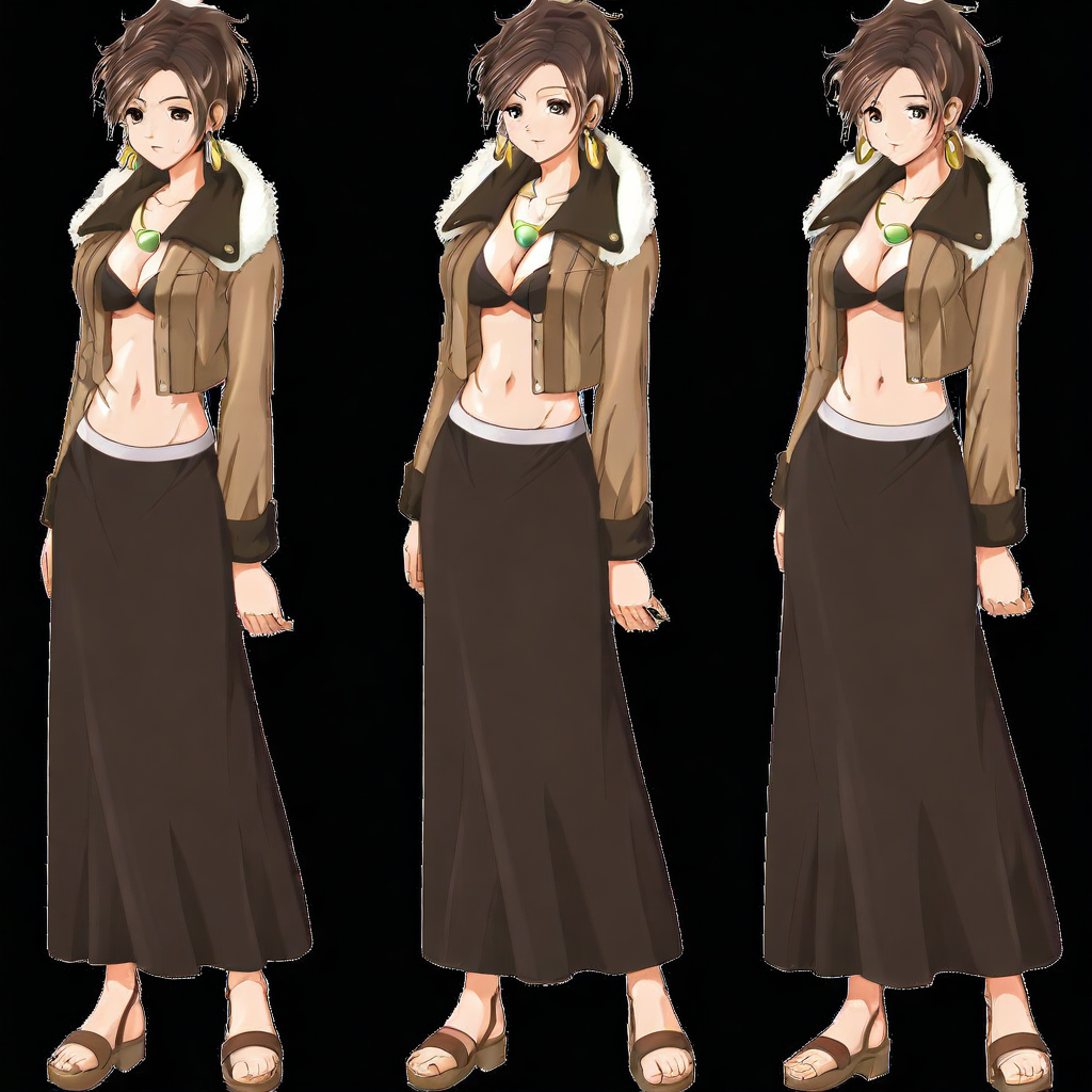 イヤリング、ネックレス、黒いブラ、胸元、茶色のジャケット、開いたジャケット、ファーのトリム、お腹の部分、長いスカート、茶色のスカート、サンダル