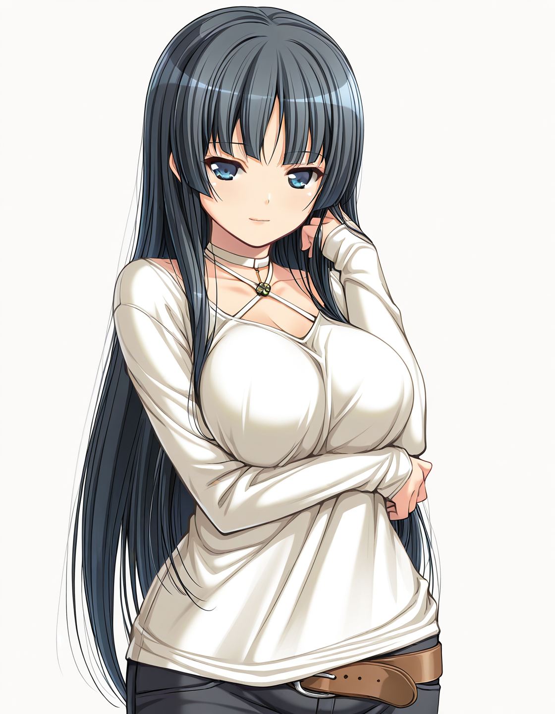 kaguya_casual, choker, white shirt, long sleeves, halterneck, brown belt, black pants