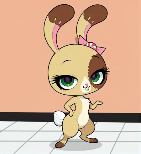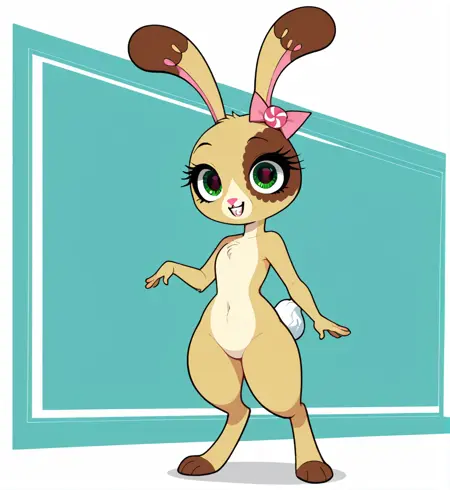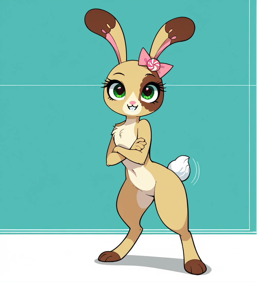 ButtercreamSundae, semi-anthro, female furry, Rabbit, yellow and brown and white fur, green eyes, pink nose, Rabbit ears, Rabbit nose, tail, Rabbit tail, chibi, solo, furry, furry female, three tone fur, bow, pink bow