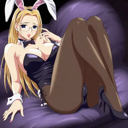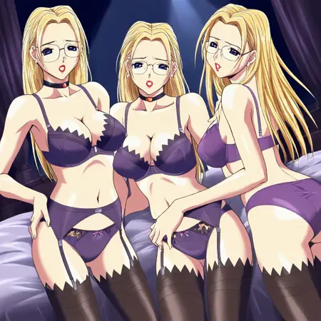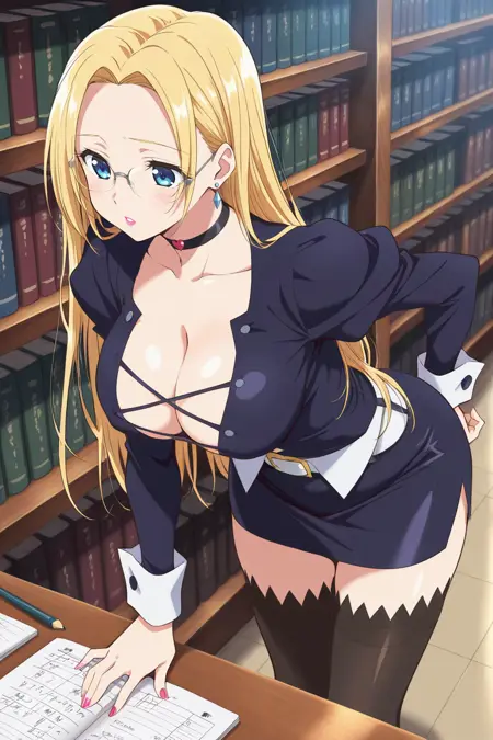 金髪、長い髪、分け目のある髪、青い目、メガネ、大きな胸、リップスティック、耳飾り、