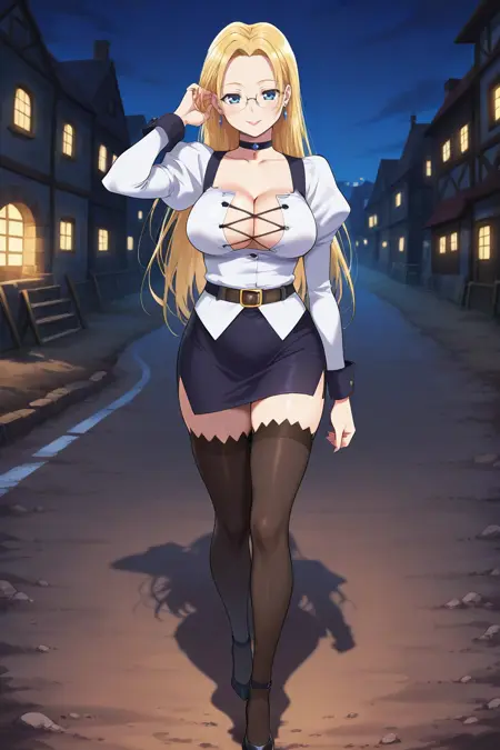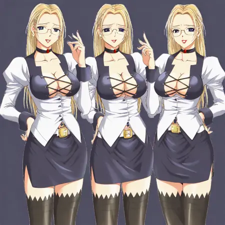 デフォルトの衣装、チョーカー、胸元の露出、鉛筆スカート、ミニスカート、ベルト、ブラックの太ももまであるストッキング、