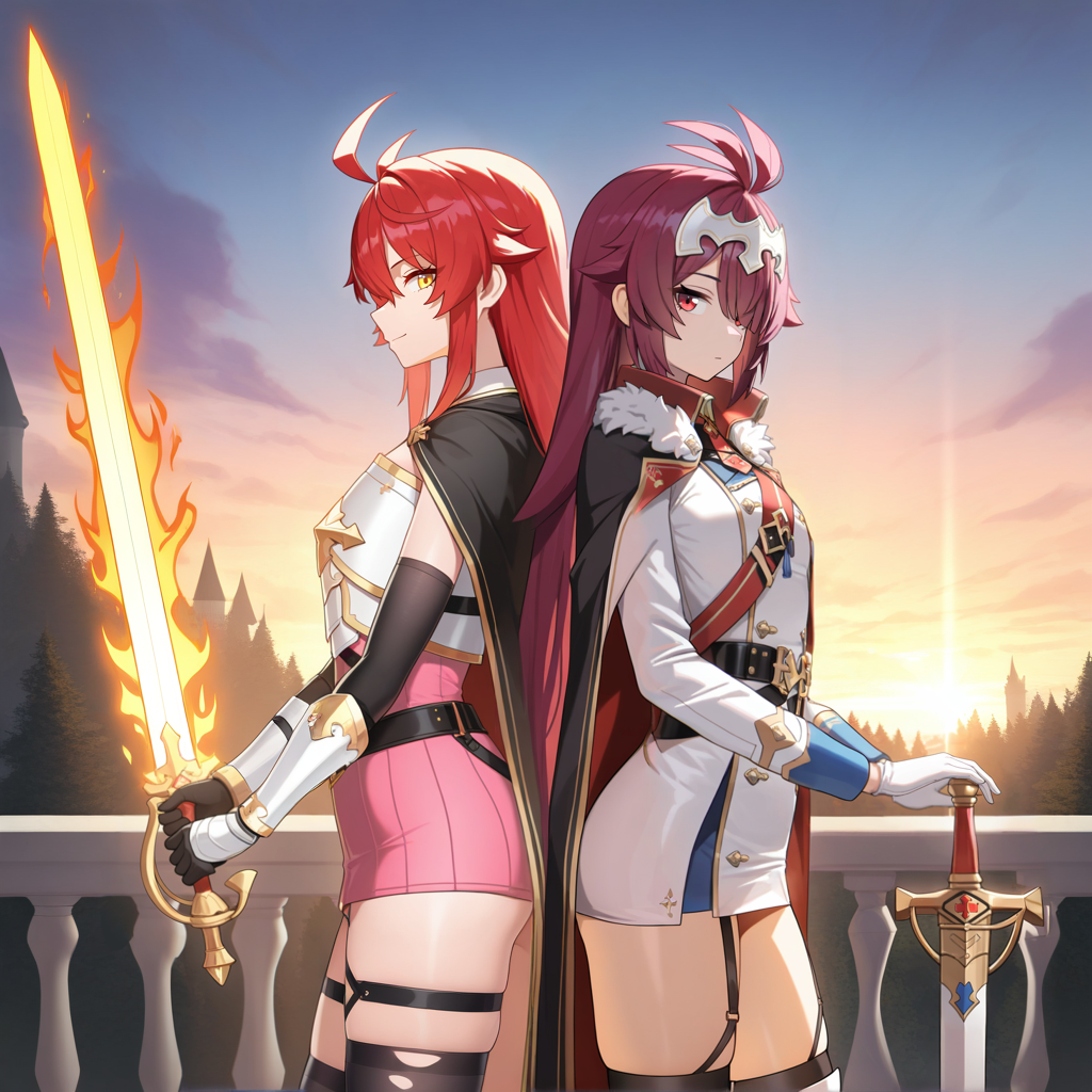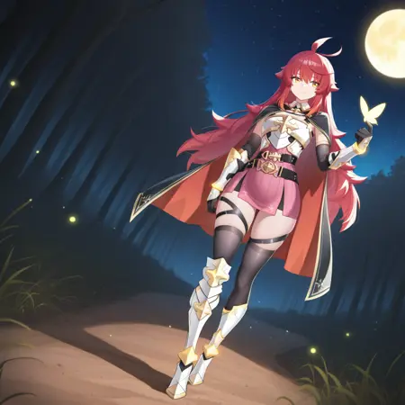 CermiaES, Crm_Def, 红发, 黄眼, 长发, 天线发, 侧发, 渐变瞳色, 黑色斗篷, 双侧斗篷, 斗篷, 带领子斗篷, 白色领子, 胸甲, 白色盔甲, 金色镶边, 短裙, 粉色裙子, 纹理裙, 腰带, 黑色腰带, 腰带扣, 分离袖子, 黑色袖子, 护腕, 黑色手套, 手套, 大腿绑带, 小臂护甲, 黑色过膝袜, 破损过膝袜, 装甲靴, 高跟靴, 小腿护甲, 不对称鞋子, 单膝护垫,