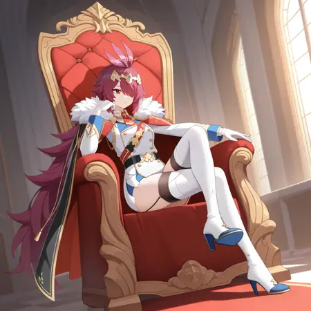 CermiaES, 深粉发, 天线发, 发丝遮住一只眼, 红眼, 大腿靴, 白色鞋履, 发饰, 极长发, 毛皮镶边, 大腰带, 头饰, 高领, 白色手套, 透明锁骨, 多重腰带, 按扣, 徽章, 黑色腰带, 红色腰带, 长矛饰带, 毛皮镶边斗篷, 红色斗篷, 替代黑色斗篷, 双色斗篷, 蓝色流苏, 白色连衣裙, 带领子连衣裙, 军装, 军事礼服, 双排扣, 红色领带, 替代金色镶边, 蓝色袖口, 白色袖子, 长袖, 超短裙, 蓝色裙子, 裙子在连衣裙内, 微型连衣裙, 吊袜带, 过膝袜, 黑色过膝袜, 袜子在靴子内, 蓝色鞋底, 高跟鞋,