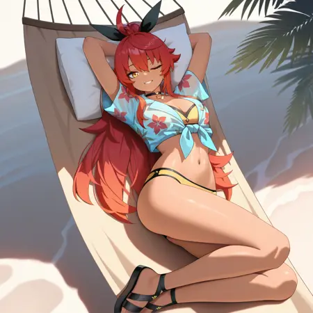 CermiaES, Crm_Swm, 红发, 黄眼, 高马尾, 长发, 天线发, 侧发, 泳装, 渐变瞳色, 黄色比基尼, 比基尼外衣, 透明上衣, 黑色丝带, 头发丝带, 吊坠项圈, 印花上衣, 暴露胸部, 打结上衣, 浅蓝色上衣, 花卉印花, 短袖, 透明袖子, 露腹, 肚脐, 黑色鞋履, 凉鞋,