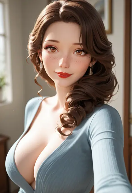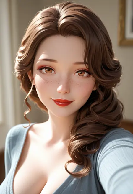 公主贝儿,char1,贝儿,1girl,独照,棕色头发,棕色眼睛,长发,微笑,看着观众,头发搭在肩上,上半身,简单背景,嘴唇,卷发,长袖,灰色背景,闭嘴