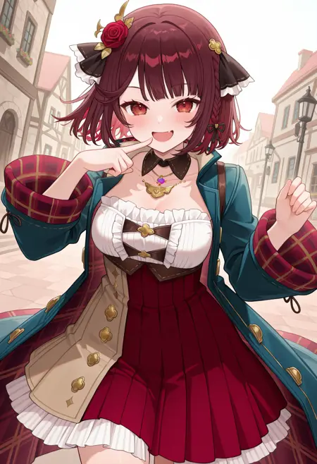 - asoph2df、編み髪、ヘアオーナメント、ヘアフラワー、バラ、ヘアリボン、黒リボン、分離襟、青コート、ロングコート、両面コート、チェック柄コート、ネックレス、ゴールドペンダント、ペンダント、白シャツ、フリル、ツートーンスカート、両面スカート、センターフリル、ハイウエストスカート、茶スカート、赤スカート、プリーツスカート、レイヤードスカート、白スカート