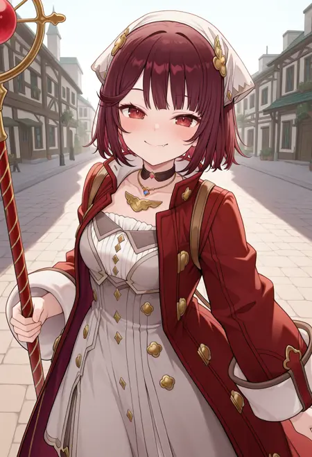 - asphpsol、白い頭部装飾、チョーカー、白ドレス、ラペル、ストラップレスドレス、ゴールドトリム、レイヤードドレス、グレーベルト、グレーポーチ、ベルトポーチ、白い鈴、赤スカート、分離袖、ワイドスリーブ