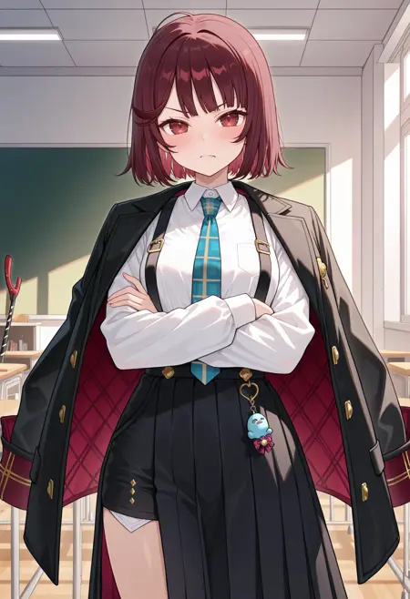 - asphmgbs、ブラックジャケット、両面ジャケット、肩にかけるジャケット、白シャツ、ロングスリーブ、青ネクタイ、チェック柄ネクタイ、ストライプネクタイ、サスペンダースカート、チャーム\(物体\)、ジュエリー、ブラックスカート、プリーツスカート、サイドスリット、ロングスカート、ショートショーツ