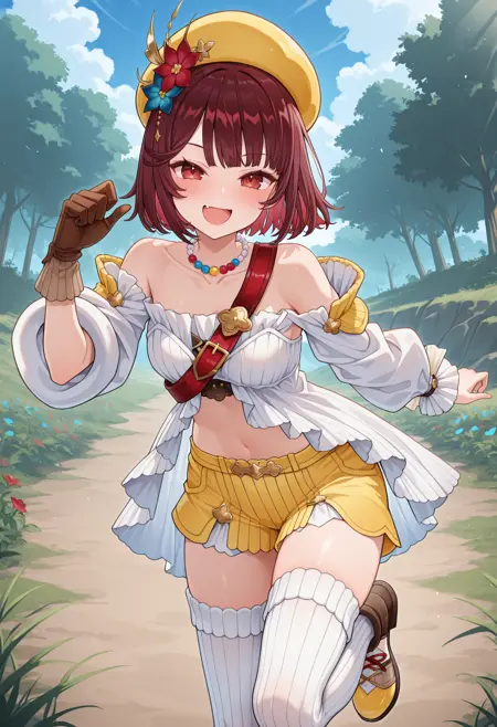 - asphnwsl、ベレー帽、ハットフラワー、青い花、赤い花、黄色い頭部装飾、ヘアオーナメント、白シャツ、シェミズ、ショルダーベルト、肩出し、ビーズネックレス、鎖骨、オフショルダー、不揃いな袖、片手袋、茶手袋、片手首カフ、お腹部分、スコート、黄ショートパンツ、レッグハイ、白レッグハイ、リブレッグハイ