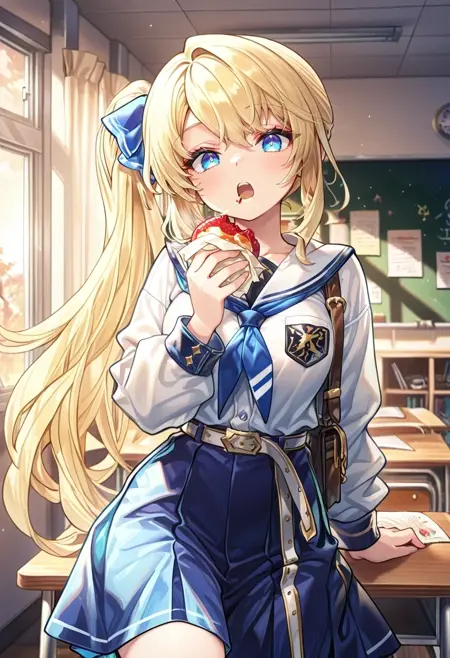 white shirt,belt,blue skirt,side ponytail,blue ribbon,