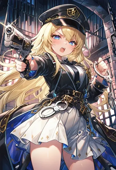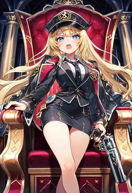 headwear,belt,black coat,white skirt,