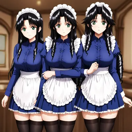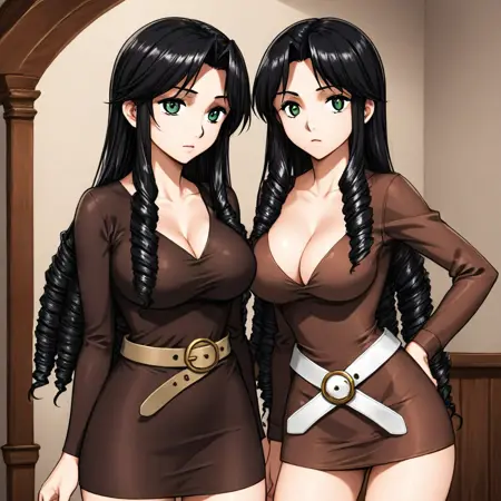 黒髪、長髪、分け目、サイドロック、ドリル髪、緑の目、大きな胸、