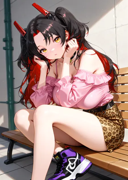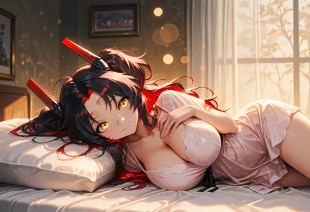 Zfünfzweidef, 긴 머리, 더블 테일, 양쪽 위로 올린 머리, 갈라진 앞머리, 다색 머리, 검은 머리, 빨간 머리, 노란 눈, 기계식 뿔, 큰 가슴, 젖가슴 노출, 초커, 언더보브 컷아웃, 사이드보브, 투명한 옷, 이톤 재킷, 검은 재킷, 빨간 재킷, 긴 소매, 흰색 하이레그 레오타드, 검은 장갑, 짧은 반바지, 검은 허벅지 양말, 검은 신발, 어깨 노출