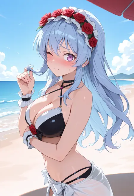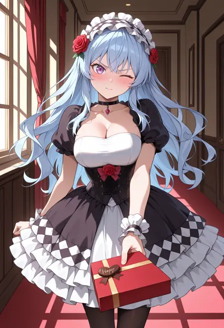 검은 목걸이, 이색 드레스, 검은 드레스, 흰색 드레스, 가슴 노출, 빨간 주름, bows, 장미, 풍성한 짧은 소매, 코르셋, 체크 무늬 옷, 레이어드 드레스, 흰 치마, 손목 커프스, 검은 팬티스타킹,