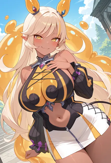 pcrnea, ブロンドの髪, とても長い髪, ストライプ入りの髪, 黄色い目, 尖った耳, 真っ黒な肌の女性, 大きな胸,