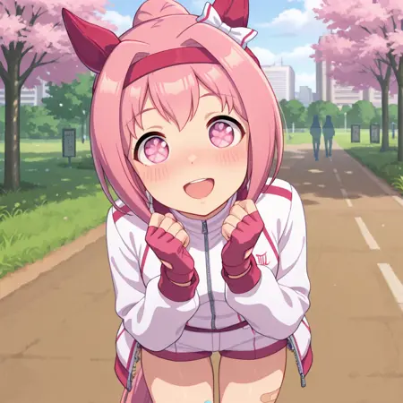 Haru Urara, Umamusume, pink hair, horse tail, horse ears, pink eyes, sakura flower-shaped pupils, petite girl, short girl, bandages