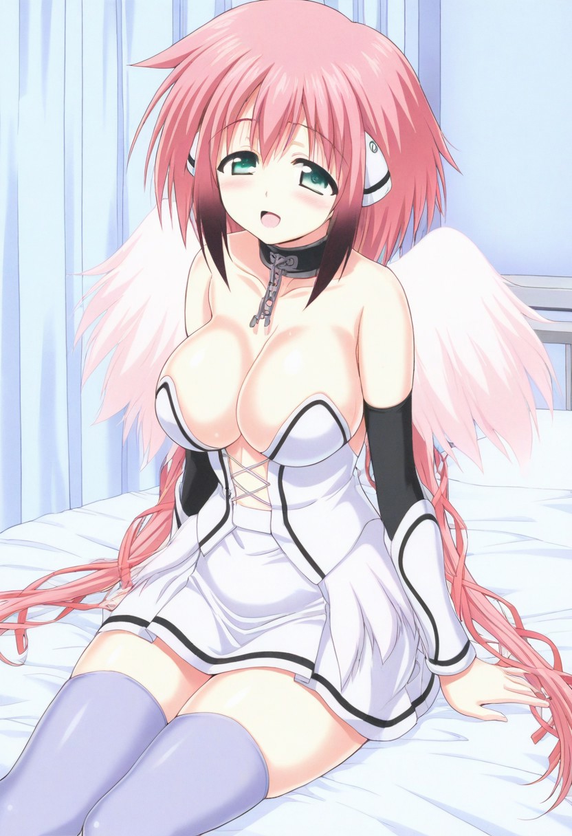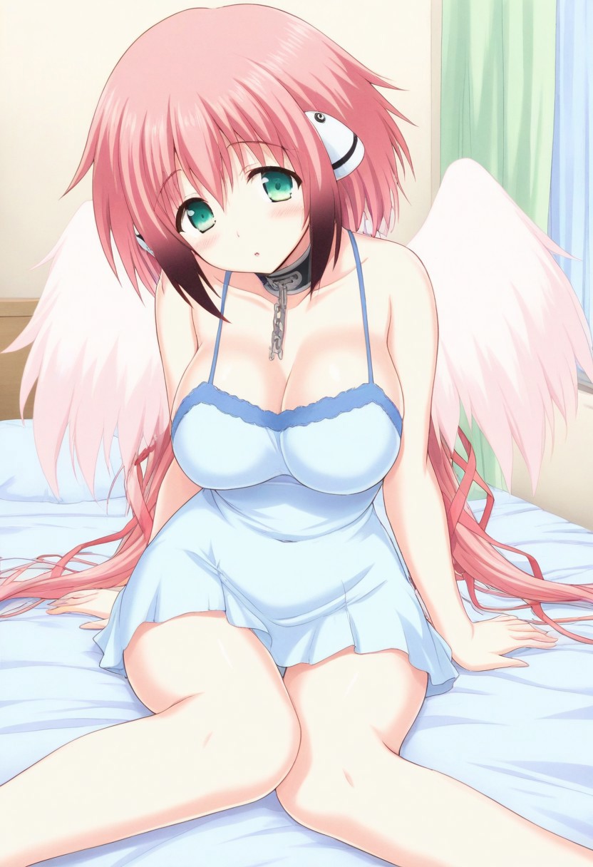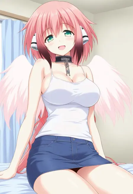 粉红色头发,绿色眼睛,翅膀,白色机械耳朵,短发并有两条辫子