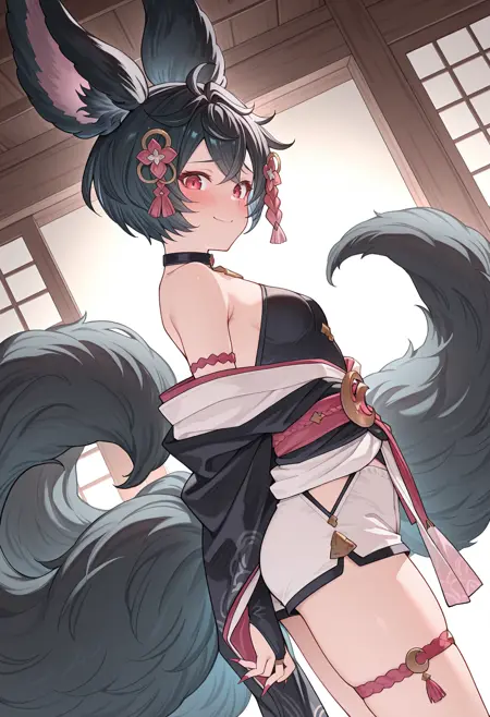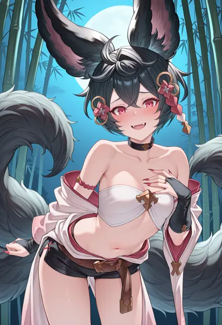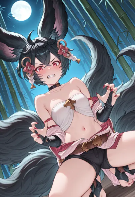 gbfyou, 黒髪, 短髪, erune, 動物の耳, 赤い目, 複数の尾, 大きな尾, ネイルポリッシュ, 尖った爪,