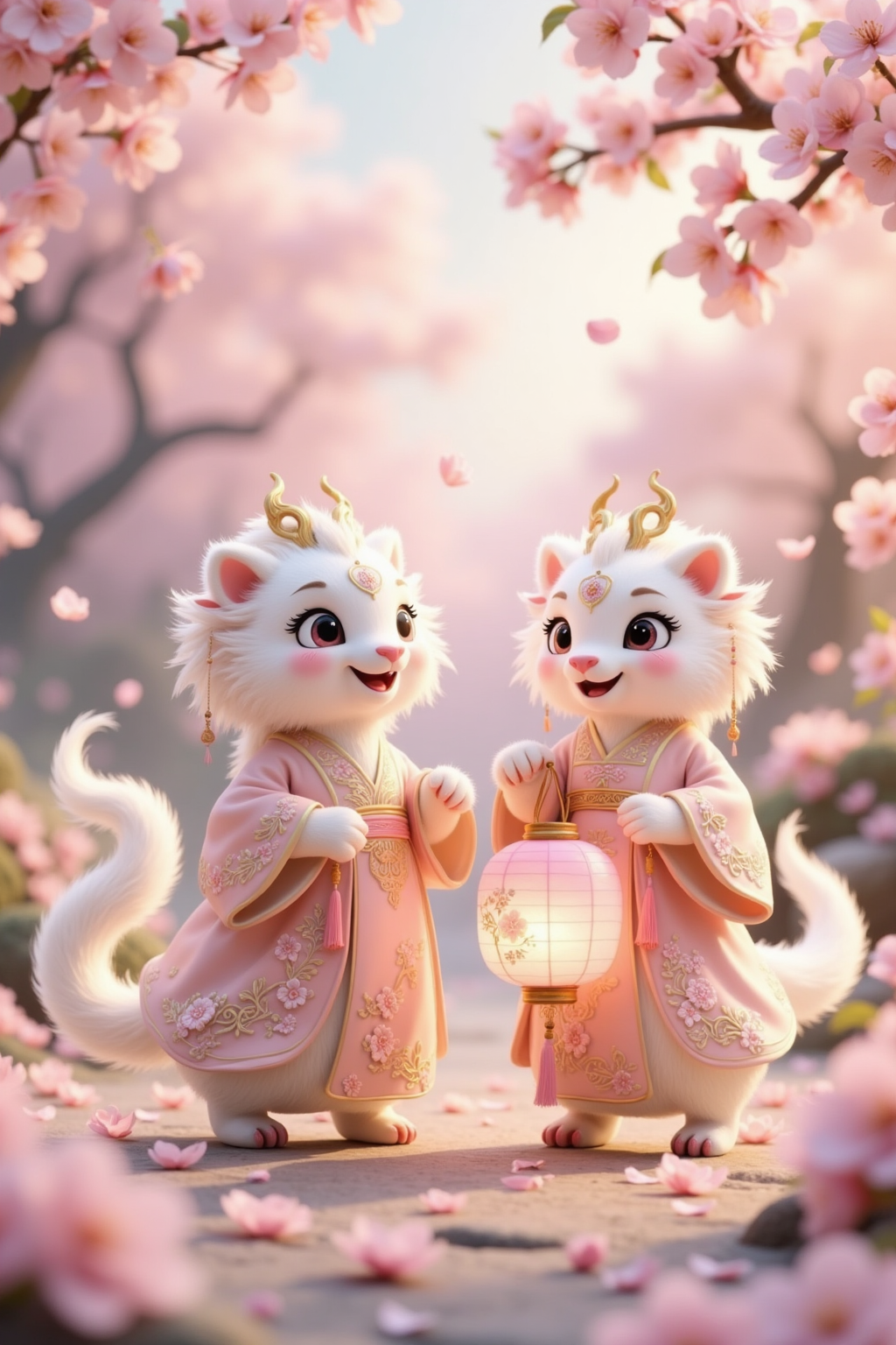 한복을 입고 등불을 든 중국의 12지신 동물, 피어난 복숭아꽃 계곡에서, 분홍 꽃잎이 날리고, 달콤한 향기 속에서, 한복에는 복숭아 문양이 새겨져 있고, 낭만적이고 상쾌한 분위기.