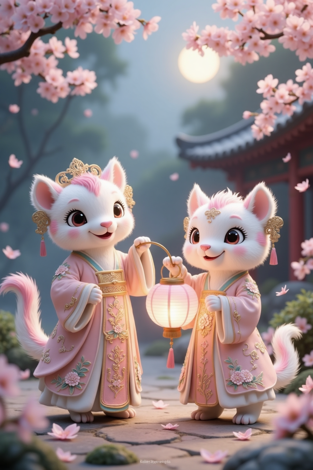 한복을 입고 등불을 든 중국의 12지신 동물, 안개 낀 고대 정원에서, 분홍 벚꽃이 떨어지고, 부드러운 달빛이 내리쬐며, 한복에는 세밀한 자수로 장식되어 있고, 꿈같고 고요한 분위기.
