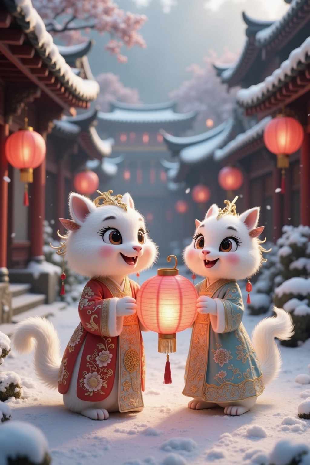 한복을 입고 등불을 든 중국의 12지신 동물, 눈 덮인 안뜰에서, 하얀 눈이 덮여 있고, 붉은 등불과 대조를 이루며, 차갑지만 축제 분위기, 순수하고 아름다움.