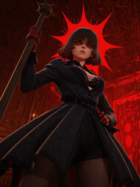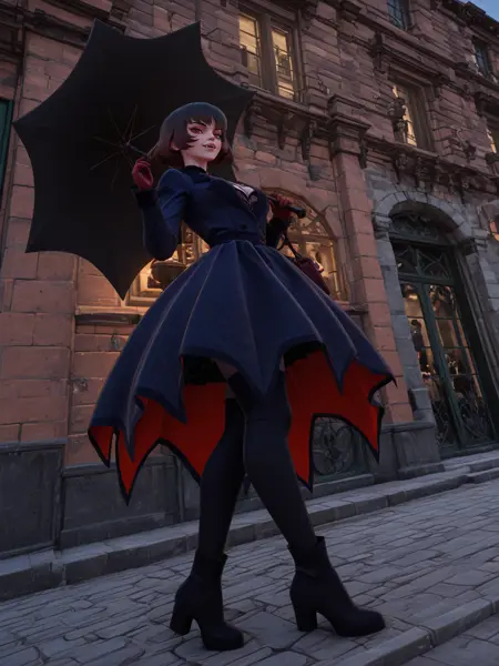 1girl, vampire girl, <lora:Mina:0.9>, cleavage, black dress, short hair, black hair, red eyes, red gloves, black shorts, black thighhighs, boots with heels, holding umbrella, holding white pistol