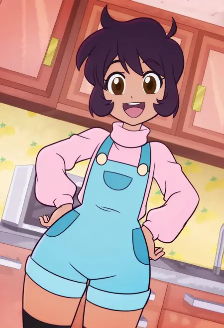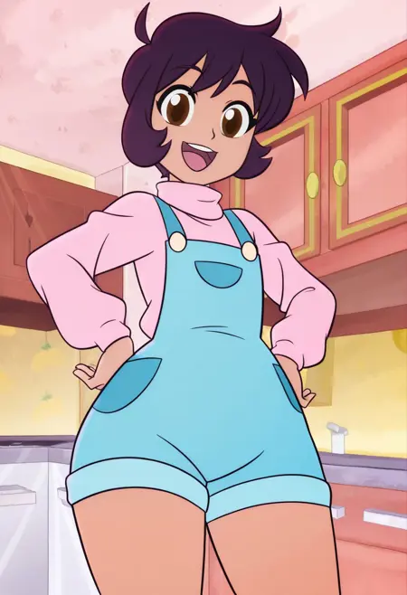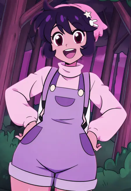 Base Prompt: Rue Cervello, tan skin, hazelnut brown eyes, bangs, black with a slight tinge of purple hair, bright pink sweater turtleneck white backpack, indigo denim overalls on top, overall shorts, pink furhat, Bright turquoise sneakers,
